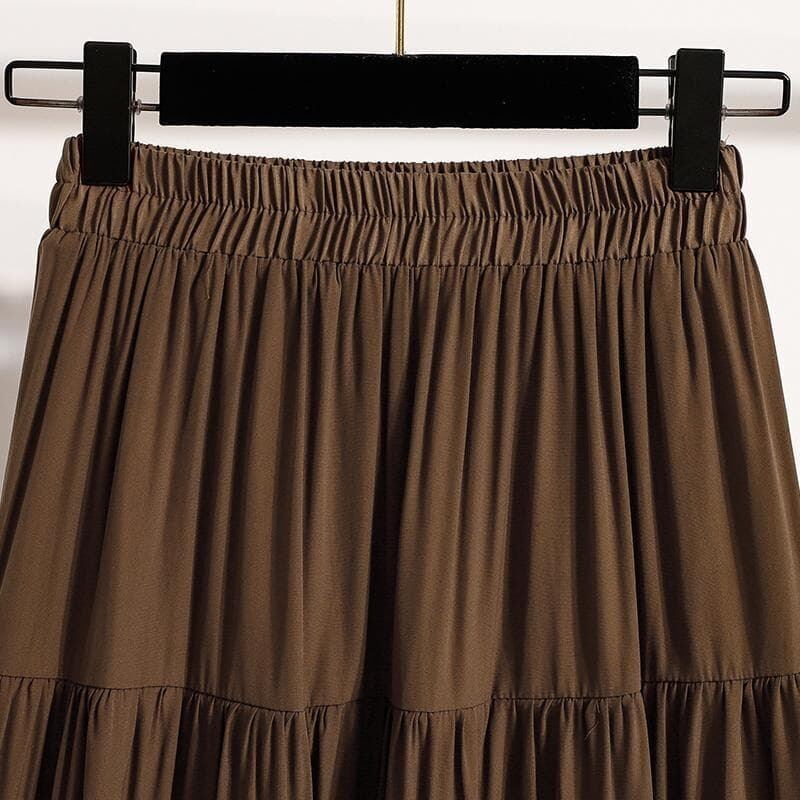 こちらのスカートはハイウエストで、スカート丈は82~86cmです。身長160cmの女性が着用した場合、裾はふくらはぎ下からくるぶしが見える程度のミモレ丈~ロング丈になります。ウエストはゴムでしっかりフィットし、ゆったりとしたシルエットで楽な穿き心地です。足首が見える丈感で、全体的にすっきりと見せてくれます。