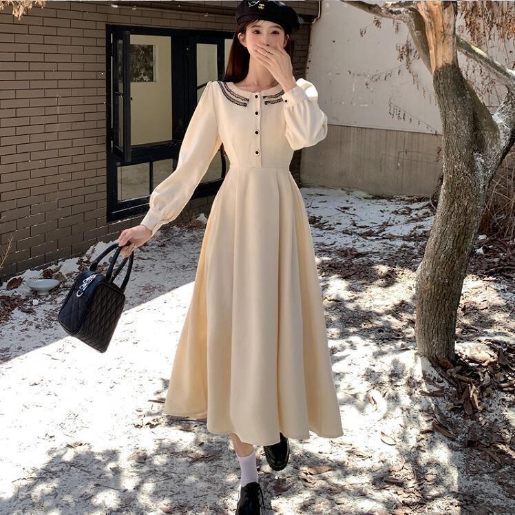 気品あふれるクラシックなデザインが特徴の、長袖 Aラインワンピースです。ヘップバーン風のエレガントな雰囲気で、パフスリーブとラウンドネックが顔周りを華やかに見せます。オフホワイトの上品な色味と無地のデザインは、日常から結婚式、年次総会などのパーティーシーンまで幅広く活躍します。