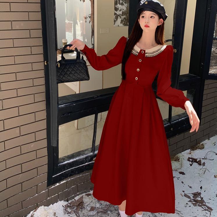 新品 大きいサイズ 白4Lロングワンピース 秋冬 Aライン パフスリーブ赤h