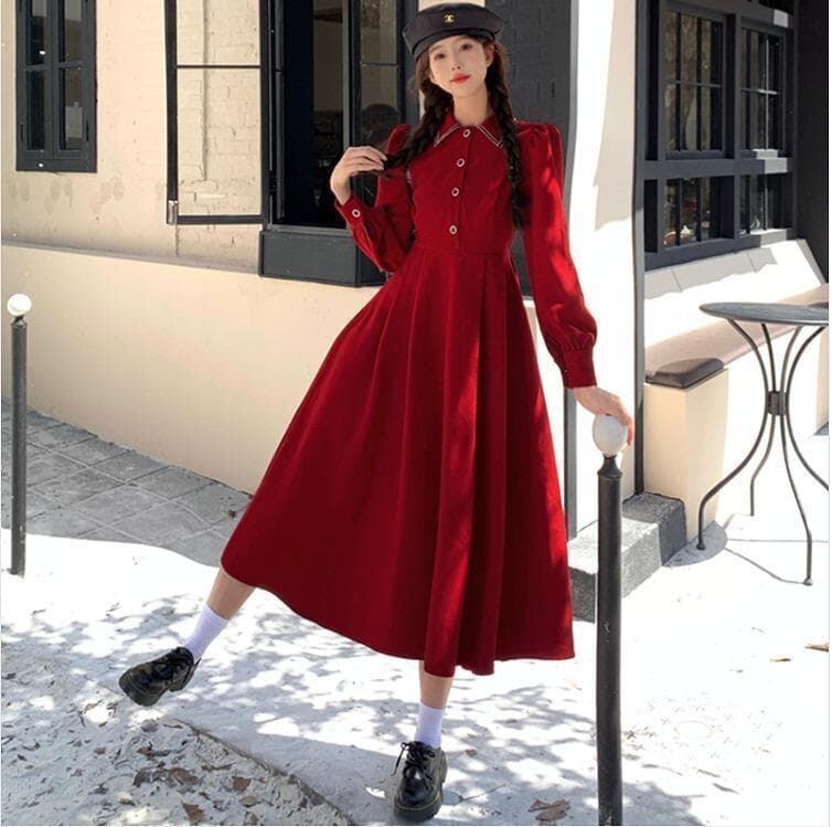 新品 大きいサイズ 赤 ロングワンピース 秋冬 パフスリーブ Aライン長袖
