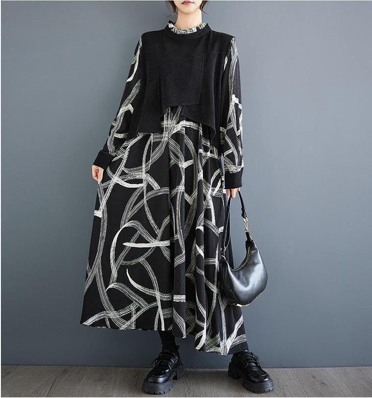 新品 大きいサイズ ゆったり ロングワンピース 秋冬 黒 プリント おしゃれ Aライン マキシ丈