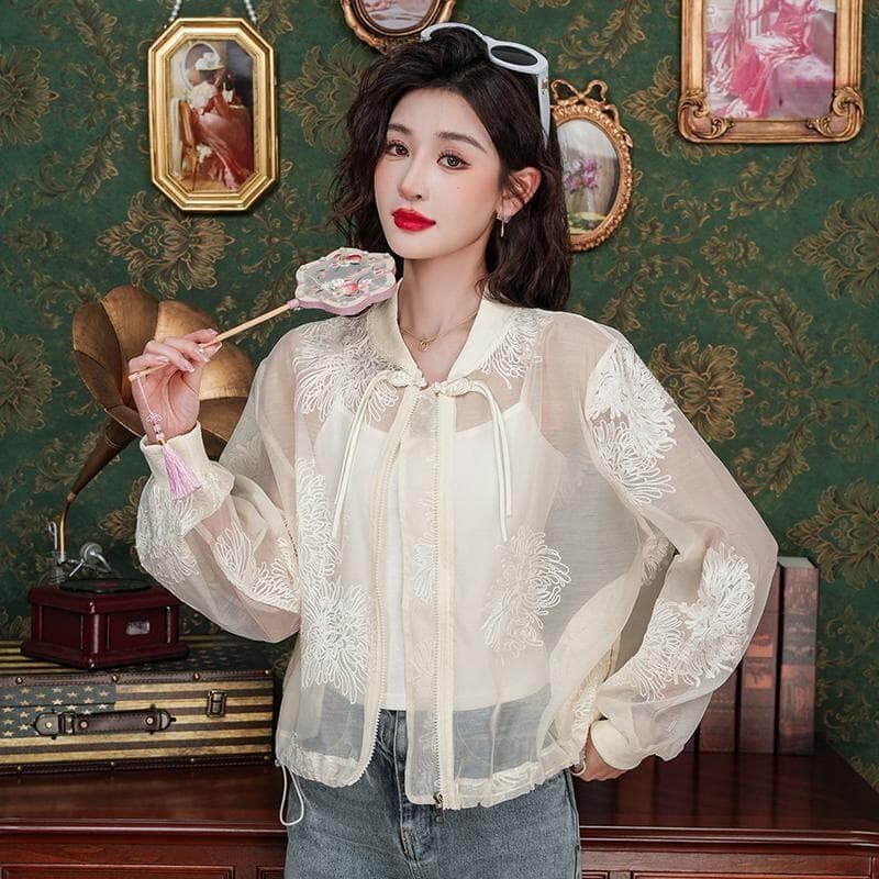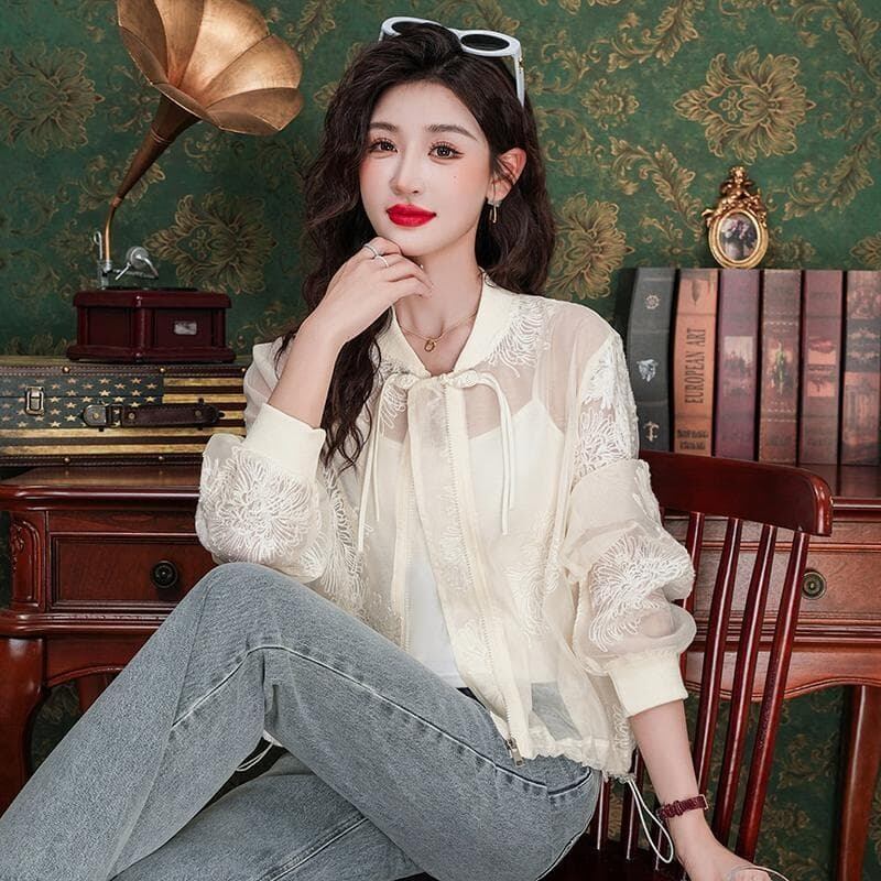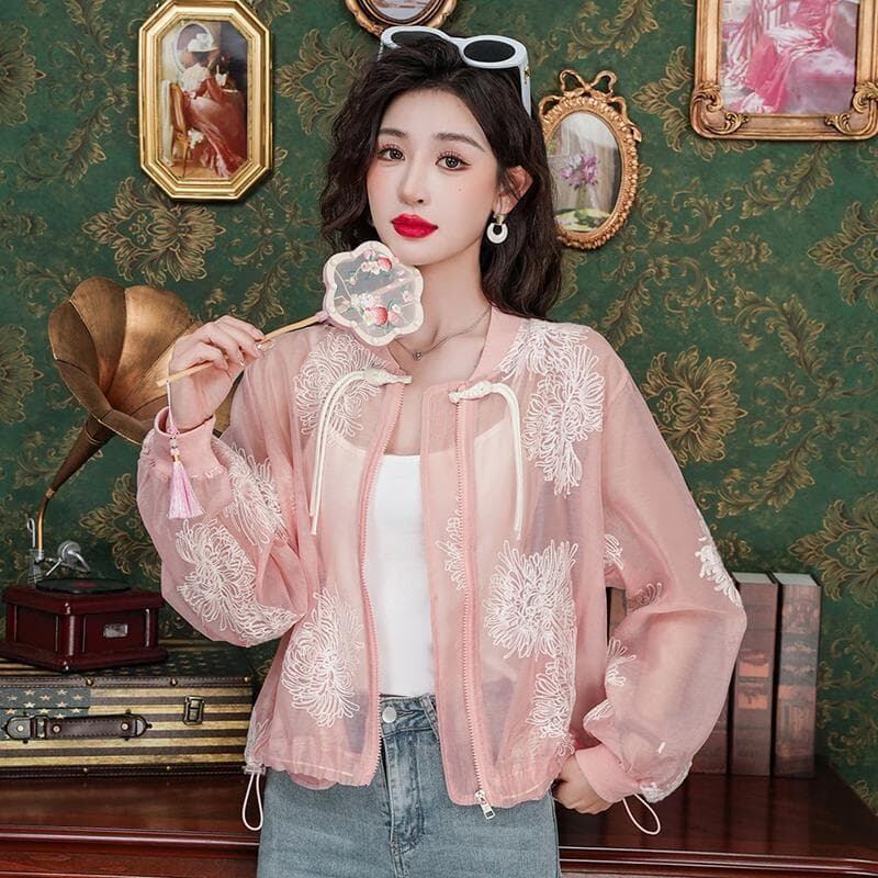 花柄刺繍が繊細で可愛らしい、シースルー素材のブルゾンです。