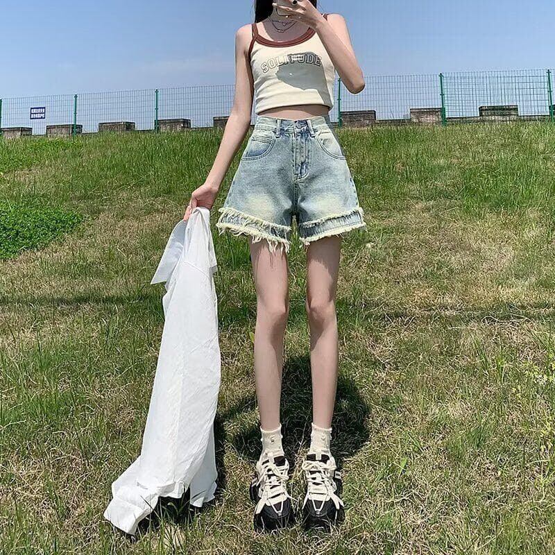 #デニムショートパンツ #フリンジ #淡色デニム #ハイウエスト #ゆったり #夏コーデ #カジュアル #新品 #レディース #フリーサイズ #脚長効果 #韓国ファッション #デニム
