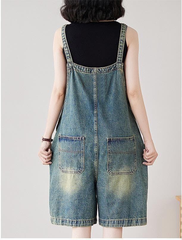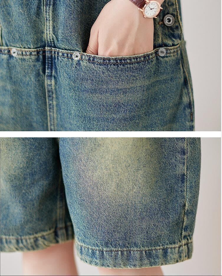 新品 デニムオーバーオール 膝丈 ゆったり ウォッシュ加工 体型カバー