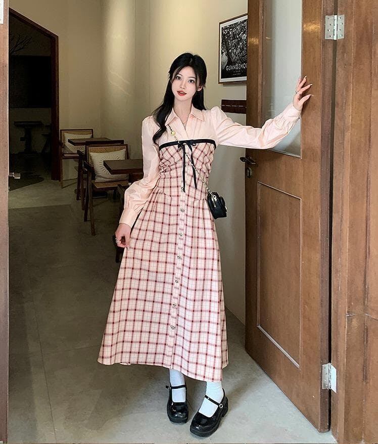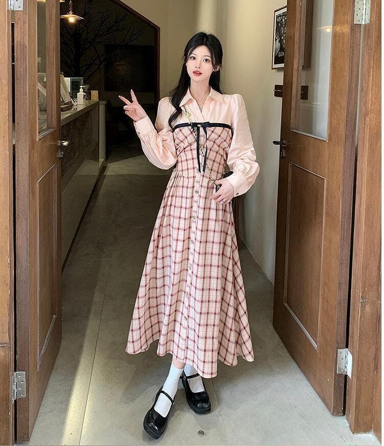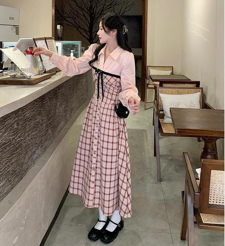 大きいサイズ レディース ワンピース ピンク ロング チェック 春 秋冬 新品 長袖