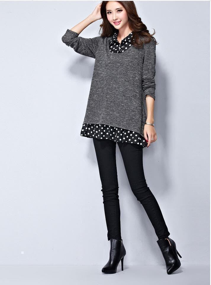 大きいサイズ レディース ドット柄 重ね着風 トップス 長袖 秋冬 新品 レイヤード風
