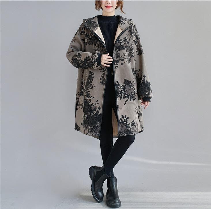 新品大きいサイズ レディース 秋冬裏起毛 コート アウター フード 花柄レトロ3