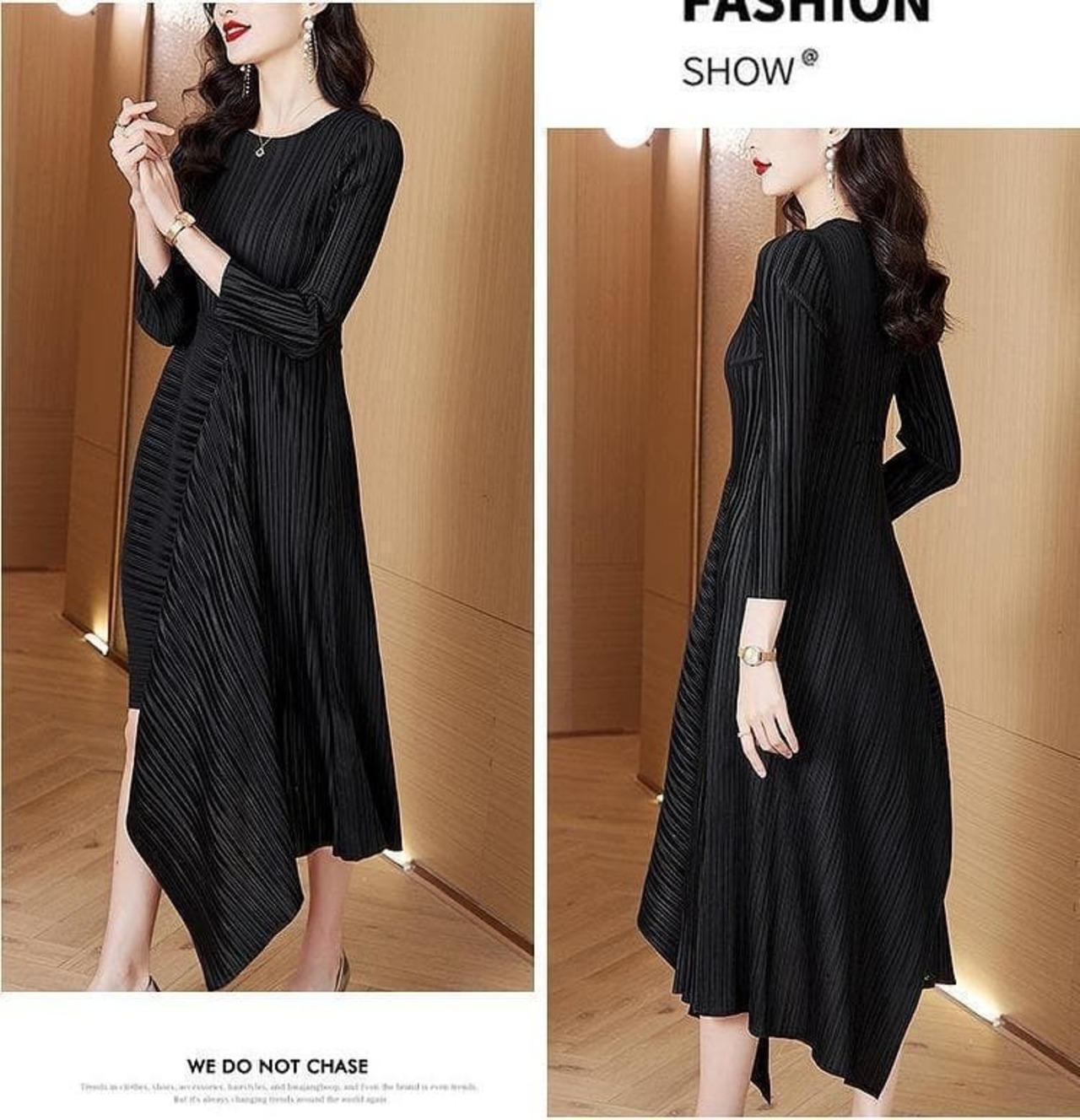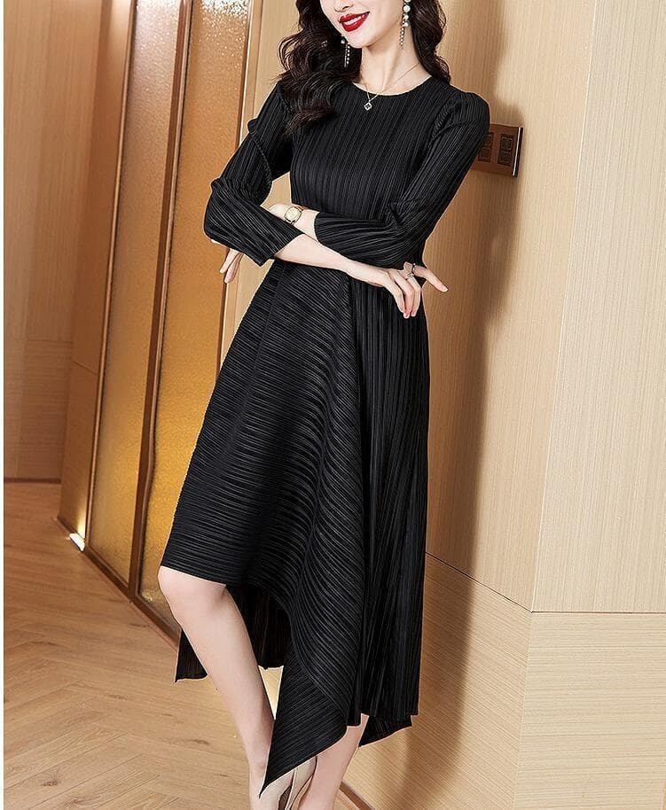 【大きいサイズ】新品 春秋 プリーツワンピース 七分袖 アシメヘム フレア 黒