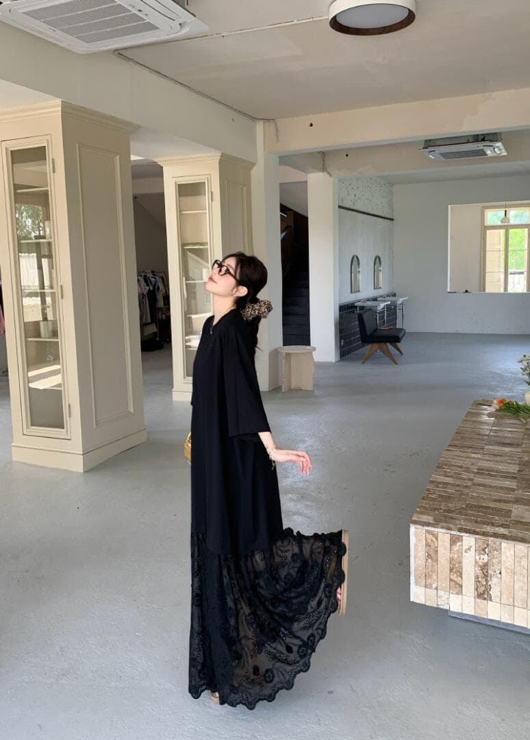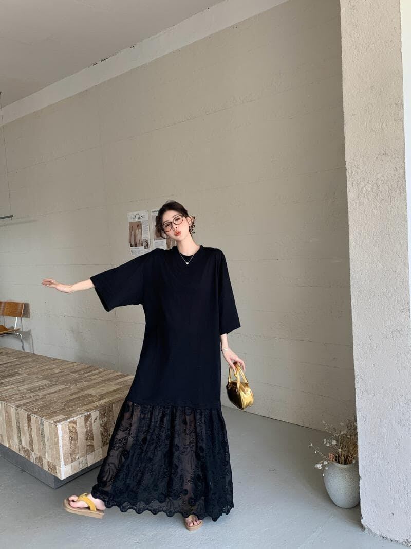 シンプルな黒のTシャツワンピースに、透け感のある繊細な黒レースの切り替えが施されており、一枚でぐっと女性らしい印象になります。