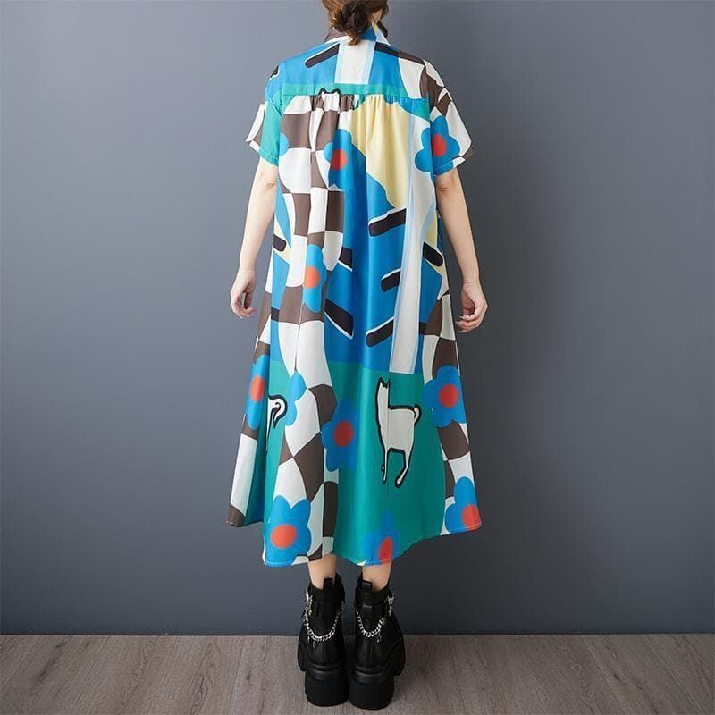 新品 個性派柄 シャツワンピース 半袖 マルチカラー ゆったり 体型カバー