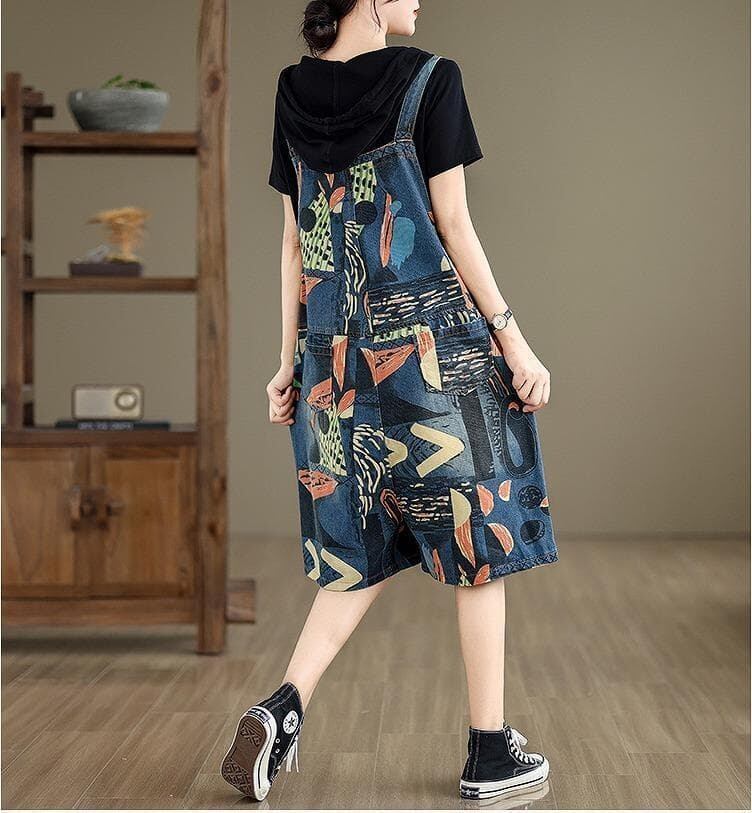 新品 個性派柄デニムサロペット ゆったり膝丈 春夏 大人カジュアル