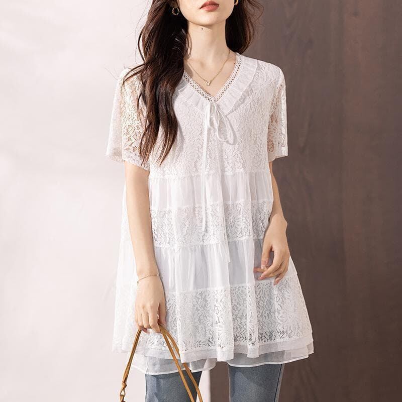 大きいサイズ トップス フリル シャツ ブルー レース レディース 春夏 半袖 新品 ゆったり ブラウス 秋