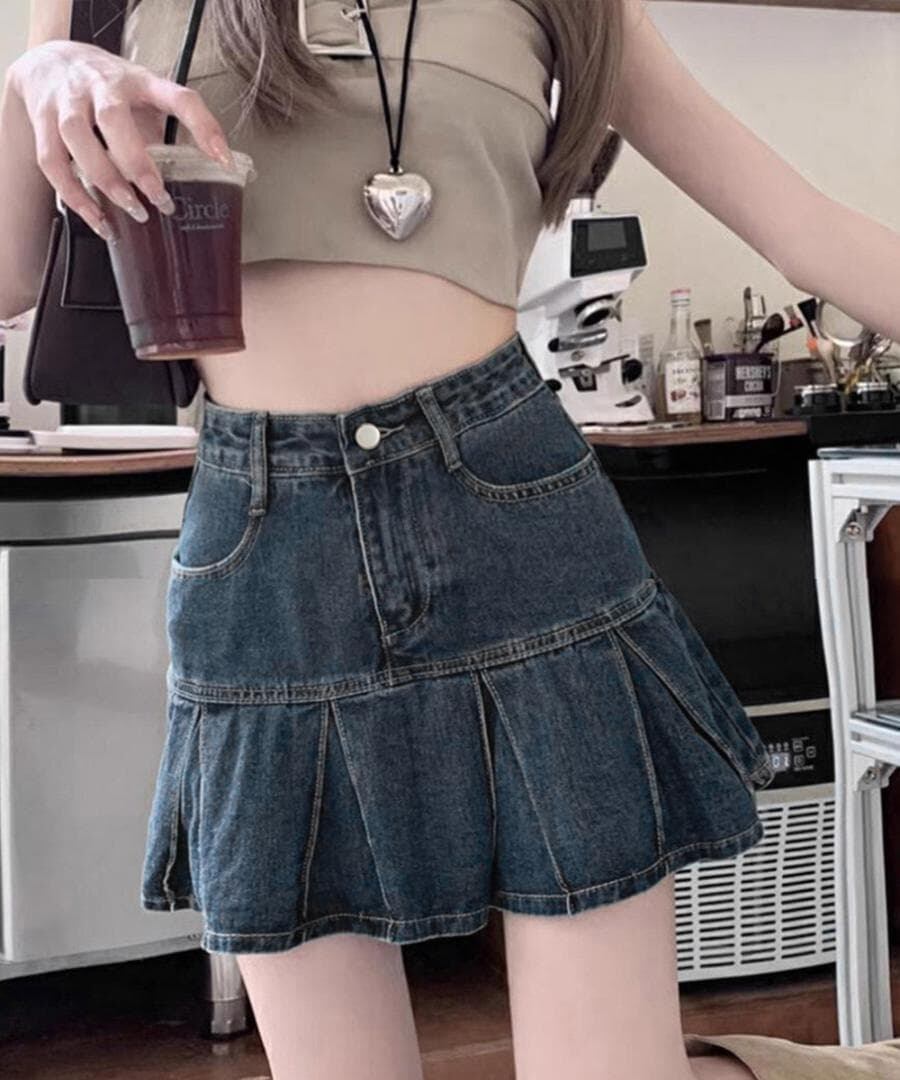 裾にプリーツが施された、ハイウエストでスタイルアップこうかのあるデニムスカート