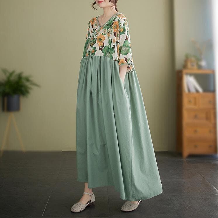 【大きいサイズ】 レディース ロング ワンピース 春夏 秋 新品 半袖 花柄 グリーン ゆったり