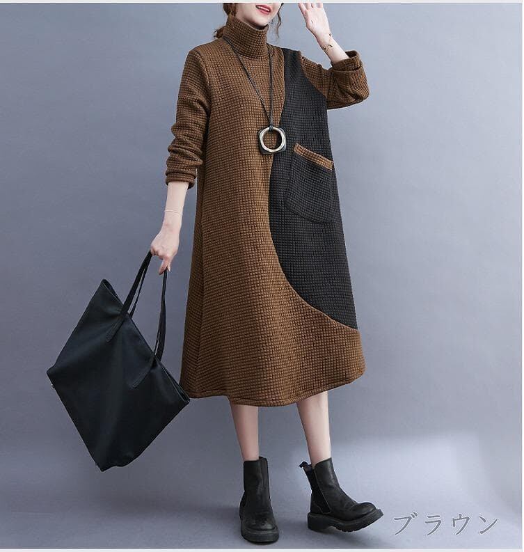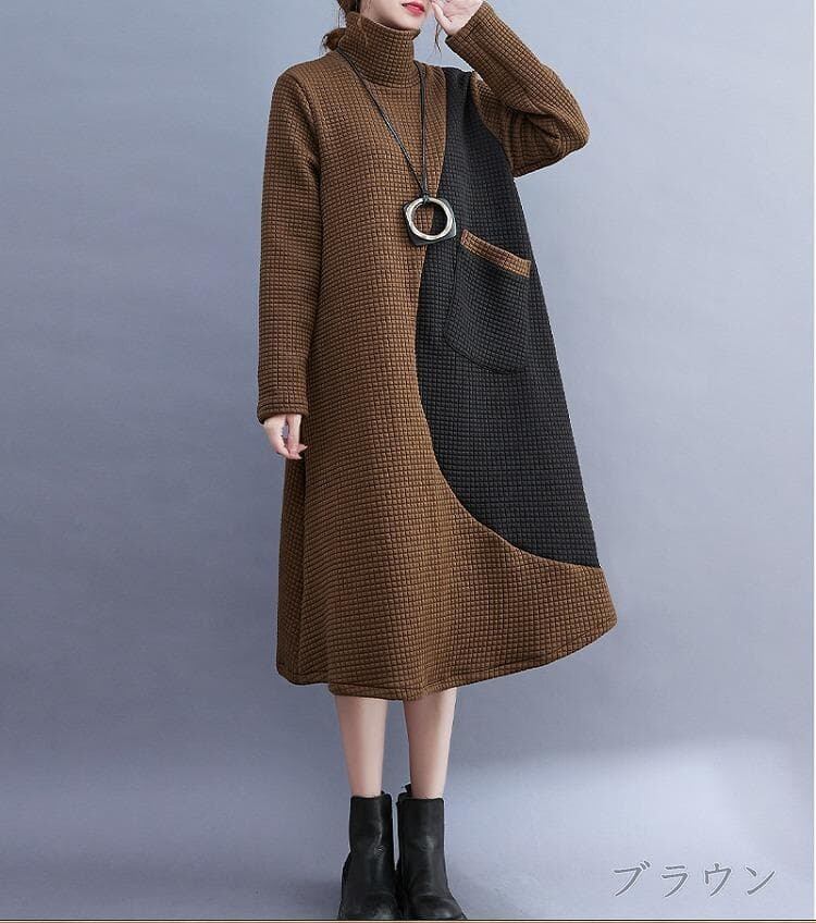 大きいサイズ レディース 秋冬 ワンピース ハイネック 茶 新品 長袖 春