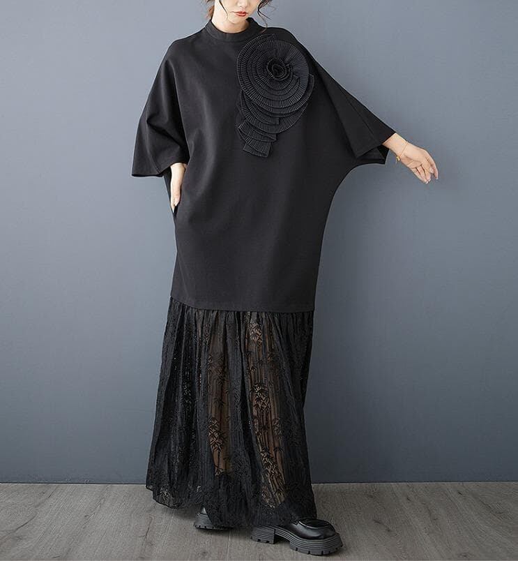 大きいサイズ ロング ワンピース レース切り替え レディース 秋冬 春 長袖 新品 シアー