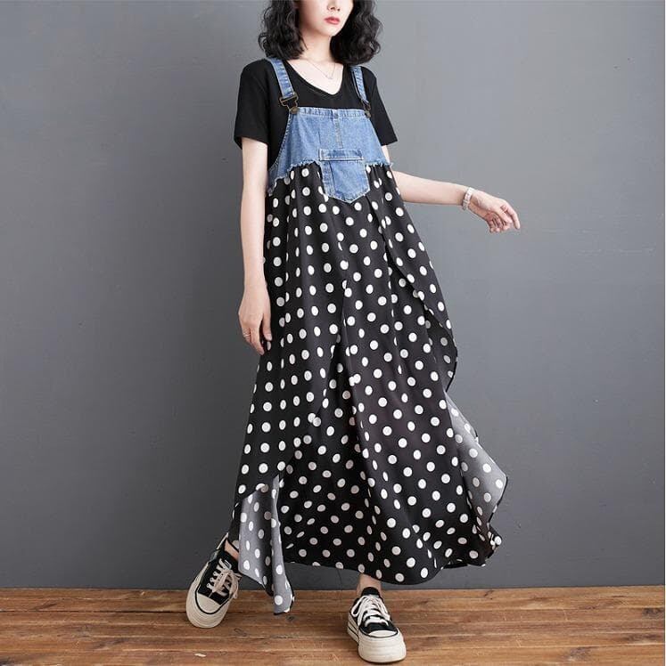 大きいサイズ サロペット レディース ドット ワンピース春夏 新品 ロング デニム 異素材