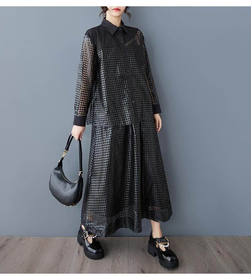 大きいサイズ スカート セットアップ レディース 春夏 新品 長袖 メッシュ レザー 上下セット トップス シアー シャツ