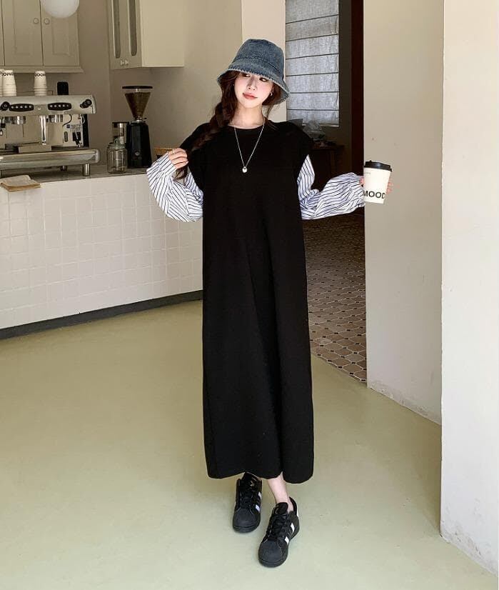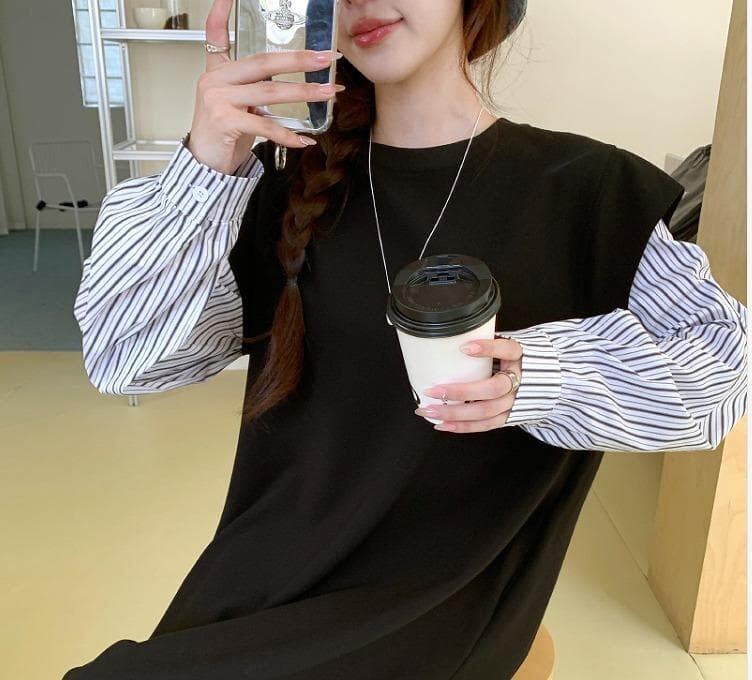 大きいサイズ ワンピース 重ね着風 レディース 秋冬 春 新品 長袖 シャツ ストライプ レイヤード