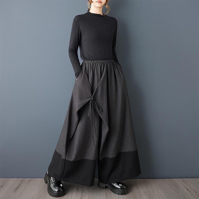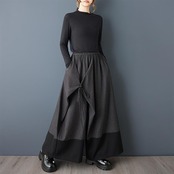 秋冬の新しい韓国スタイルの、ゆったりとしたワイドレッグパンツです。パッチワークデザインと、スカートのようにも見えるドレープ感が特徴です。
