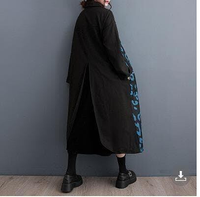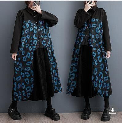 大きいサイズ 新品 韓国風 フェイクレイヤード シャツワンピース 黒 秋冬プリント