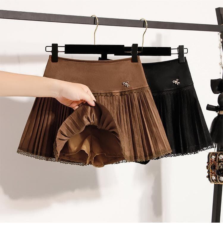 裾とウエスト部分に施されたレースの装飾が甘さをプラスする、プリーツミニスカートです。サイドの小さなリボンもキュートなアクセント。