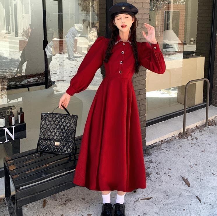 新品 大きいサイズ 赤 ロングワンピース 秋冬 パフスリーブ Aライン長袖