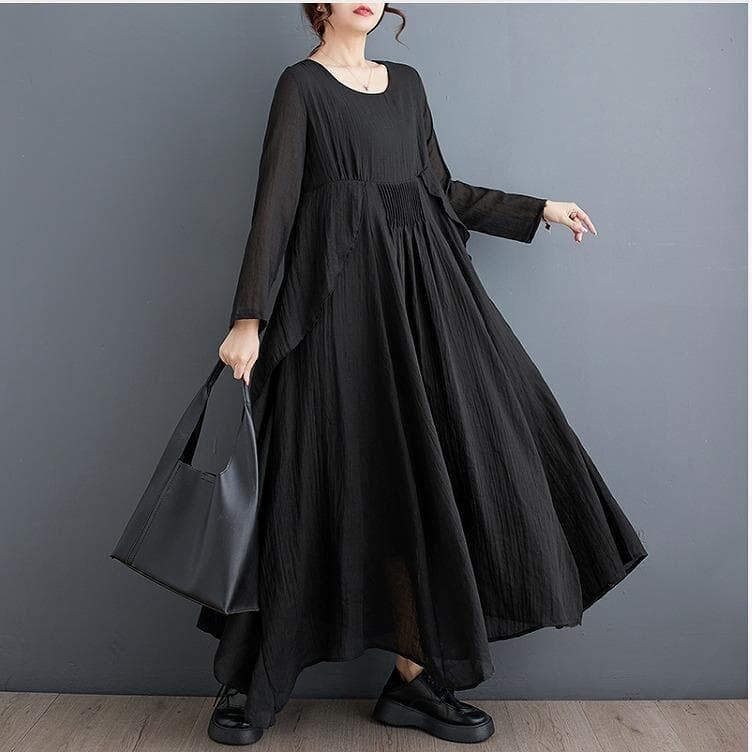 #ロングワンピース #マキシ丈ワンピース #大きいサイズ #3L #4L #黒 #ブラック #コットンリネン #プリーツ #フリル