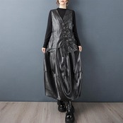 柔らかく光沢のあるブラック素材で、体型をすっきり見せながらおしゃれにカバーできます。Vネックベストと不規則なデザインのスカートが絶妙なバランスで、大人の余裕を感じる一枚。軽くて動きやすく、ニットやタートルを重ねれば冬も快適に着られます。