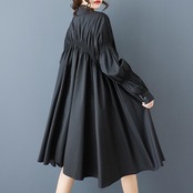 新品 プリーツ シャツワンピース 黒 レトロ ゆったり ミディ丈 秋冬 長袖d