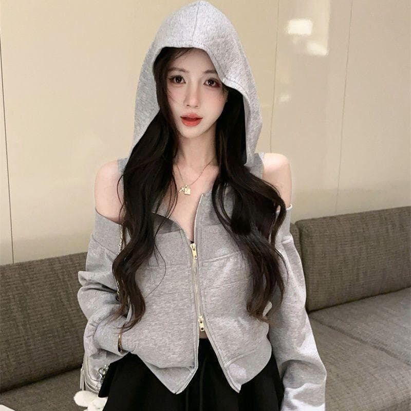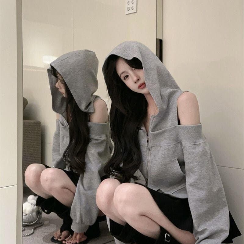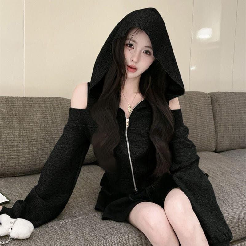 肌見せがヘルシーでトレンド感のある韓国ファッションのショート丈トップス。肩出しデザインがアメリカンホットガールな雰囲気を演出し、ゆったりとした長袖の袖とフード付きのデザインで、ストリートっぽくも着こなせるアイテムです。ジップアップ仕様なので、着脱も簡単で温度調節にも便利。