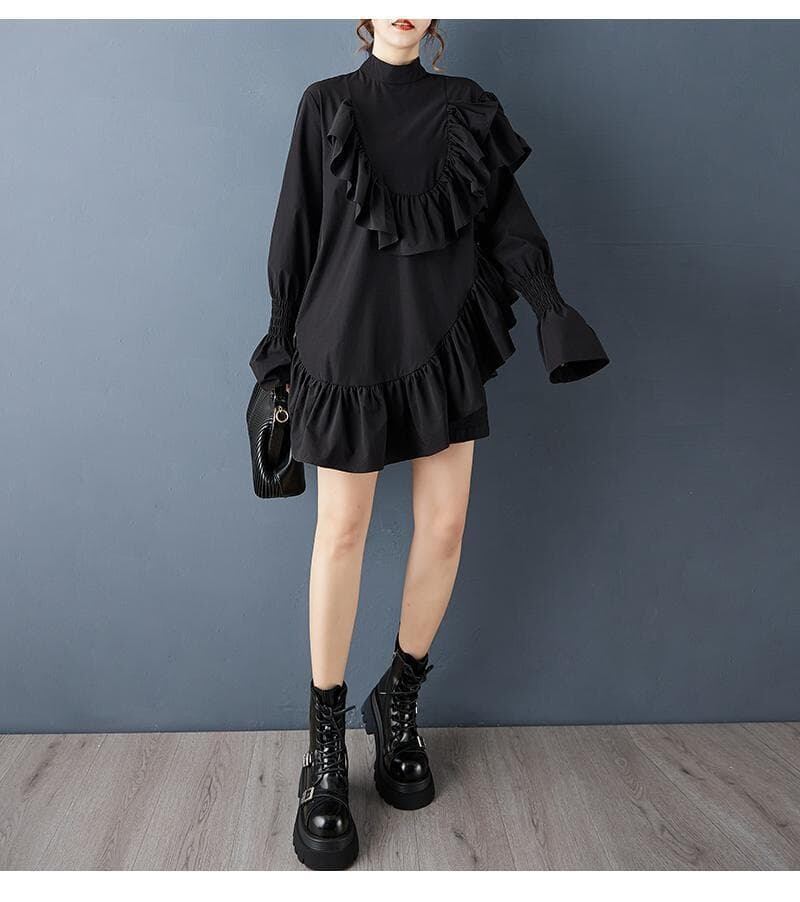 新品 大きいサイズ黒色 アシメ斜めフリルワンピース 体型カバー長袖秋冬4
