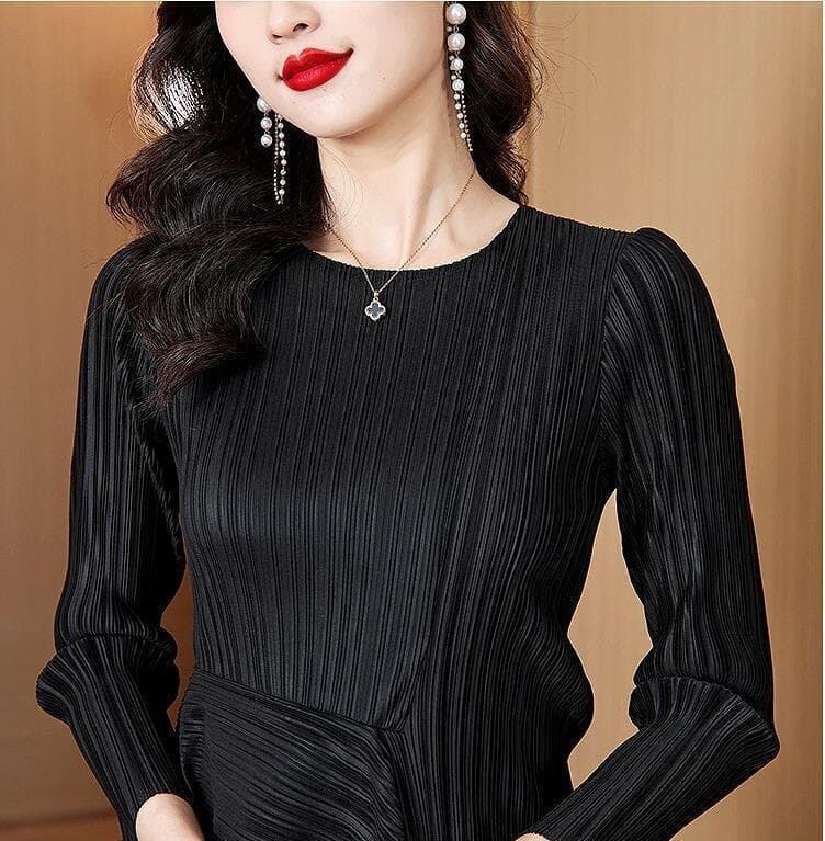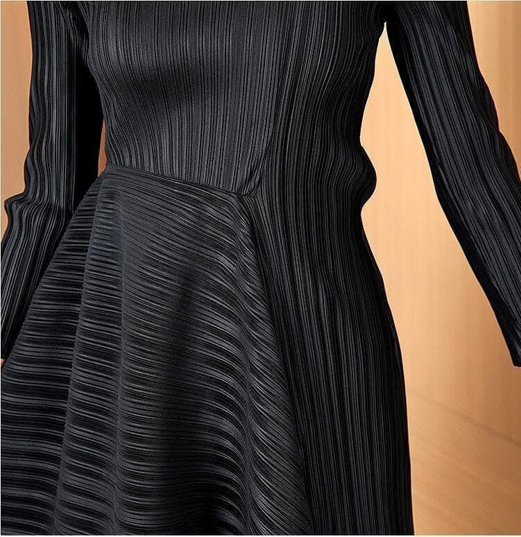 【大きいサイズ】新品 春秋 プリーツワンピース 七分袖 アシメヘム フレア 黒