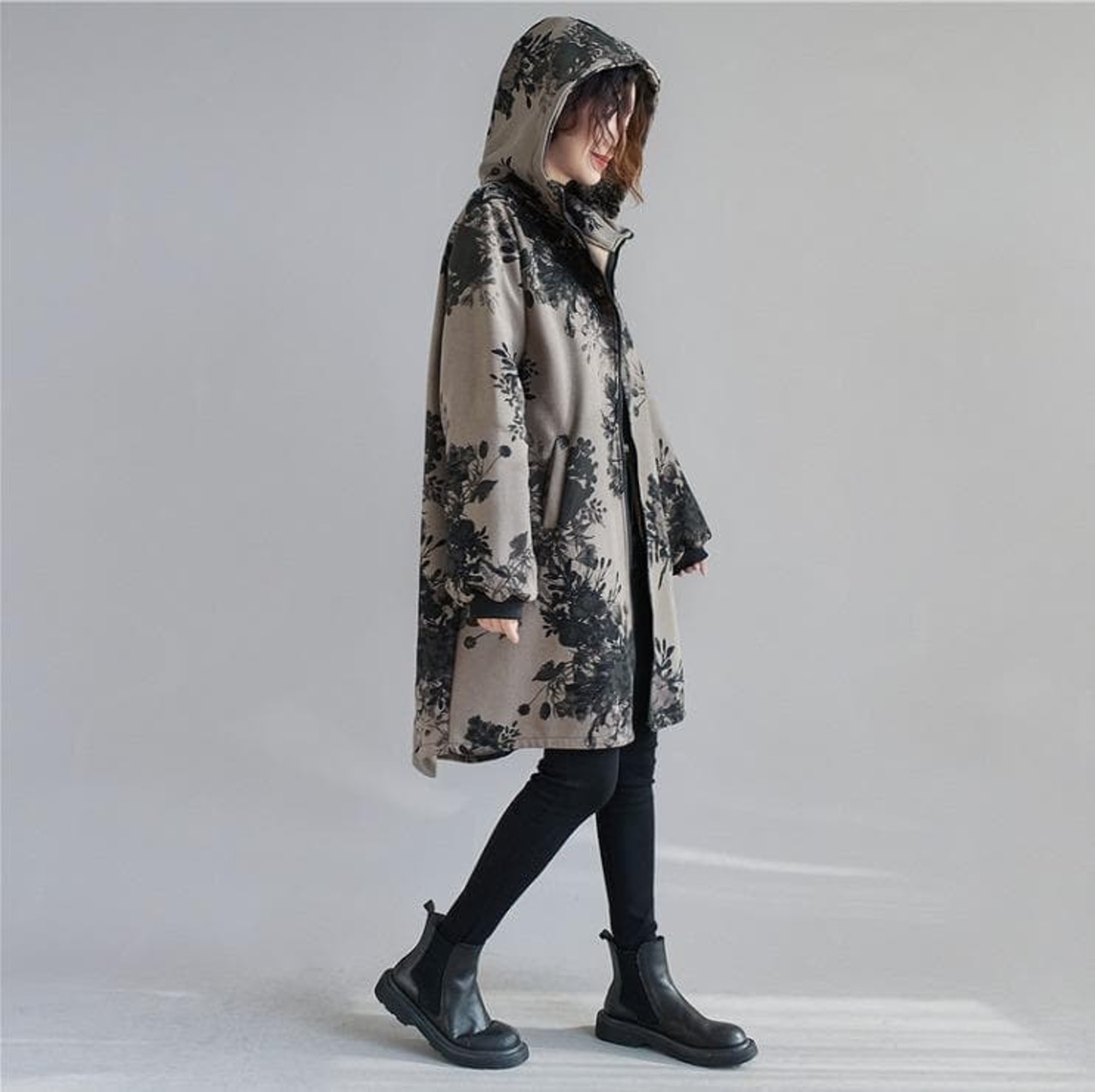 新品大きいサイズ レディース 秋冬裏起毛 コート アウター フード 花柄 レトロ