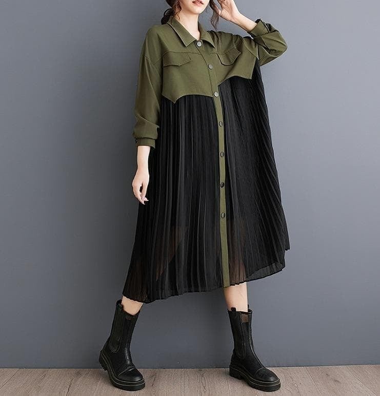 大きいサイズ プリーツ ワンピース レディース チュニック 秋冬 春 長袖 新品 シャツ カーキ