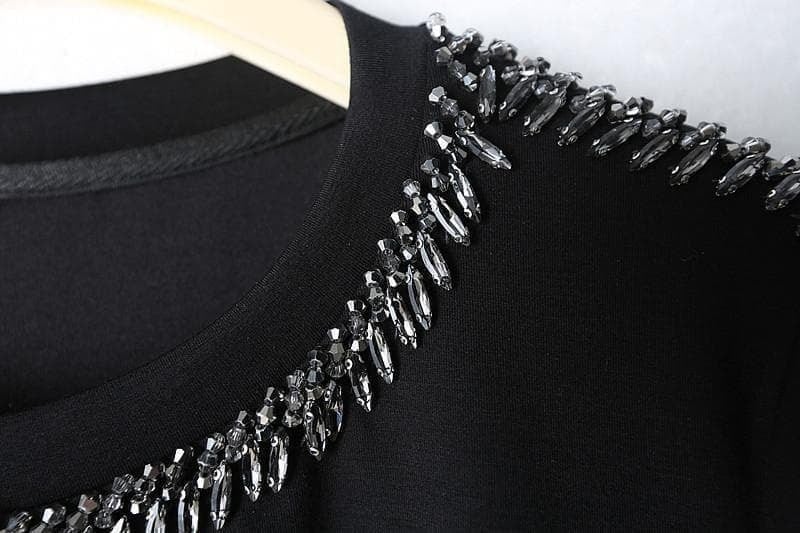 デザイン性: 首元のビジューとフリルが、シンプルなデザインに華やかさをプラス。
