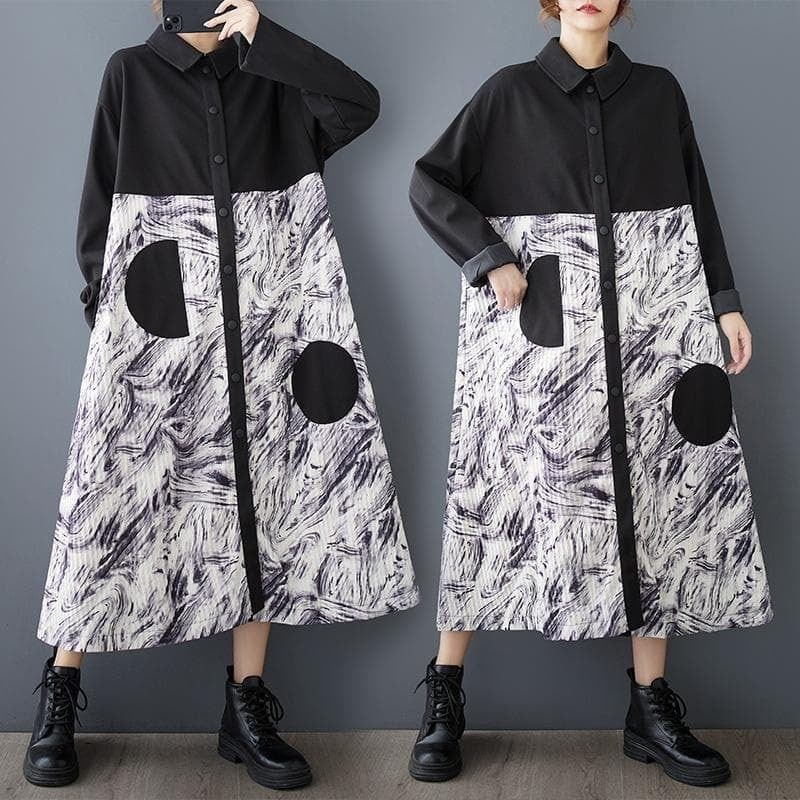 バイカラーとユニークなプリントがおしゃれなロングコートです。個性的なデザインで周りと差をつけたい方におすすめ。柔らかいポリエステル素材で、軽やかな着心地です。ボタンを閉めてワンピースのように着ることもでき、幅広いコーディネートが楽しめます。