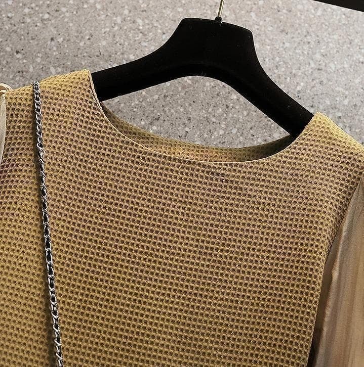 ミドル丈で、トップス部分と袖の異素材切り替え(パッチワーク)が、シンプルながらも立体感のある上品なスタイルを演出します。カジュアルにも通勤スタイルにも使える万能な一枚です。