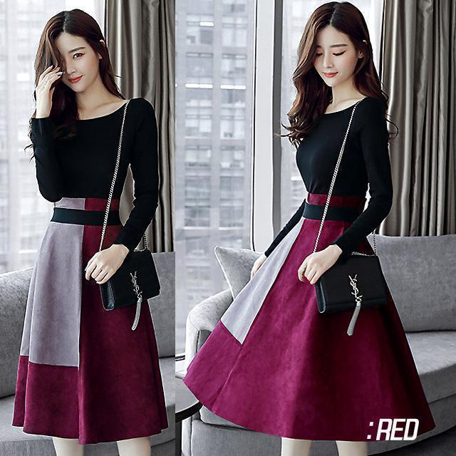 大きいサイズ レディース ボートネックトップス×スエードカラーブロックスカート☆秋冬