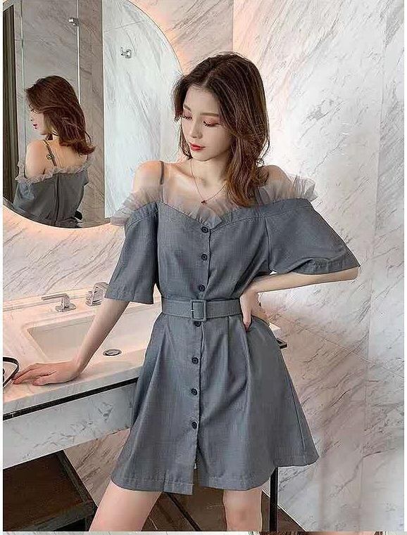 大きいサイズ レディース ベルト付き オフショルダー ワンピース 半袖 五分袖 春夏 肩出し