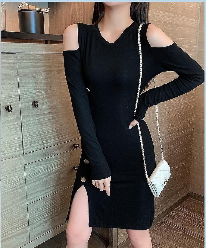 【大きいサイズ レディース】秋冬 オープンショルダーワンピース 肩見せ 肩出し 長袖 小さいサイズ