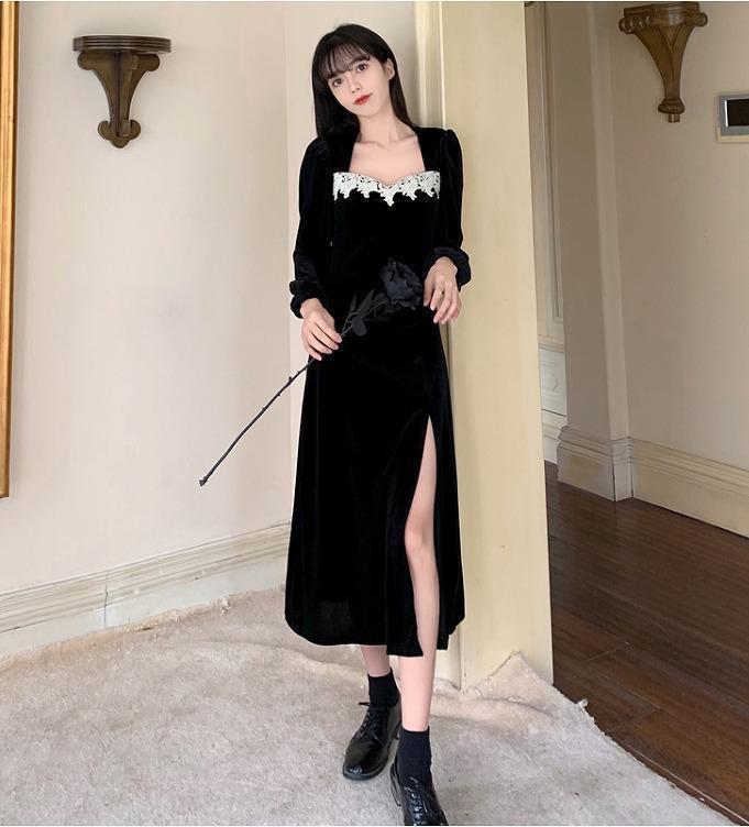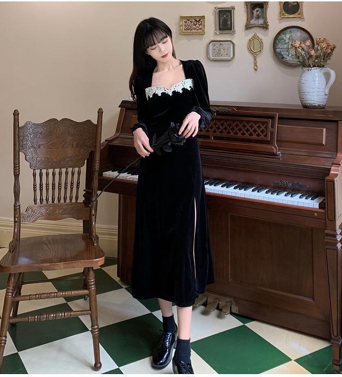 【大きいサイズ レディース】 スリット ワンピース スクエアネック 黒 長袖