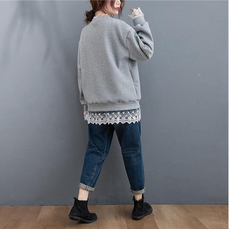 【大きいサイズ レディース】秋冬 レース袖・裾 トレーナー トップス 重ね着風 長袖