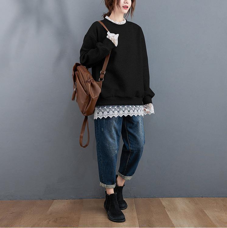 【大きいサイズ レディース】秋冬 レース袖・裾 トレーナー トップス 重ね着風 長袖