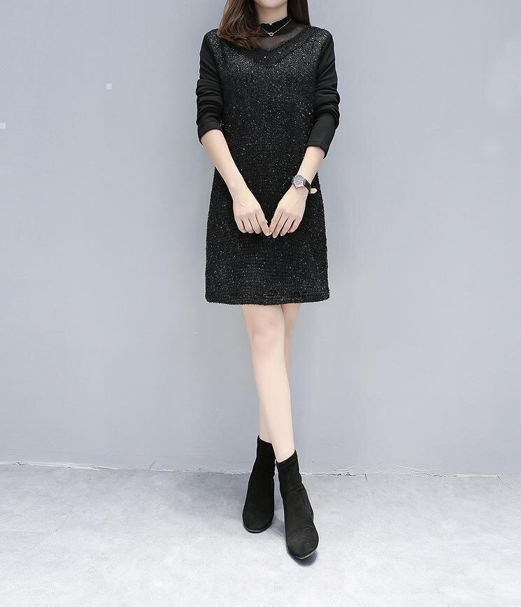 【大きいサイズ レディース】秋冬 裏起毛 ワンピース ハイネック シースルー