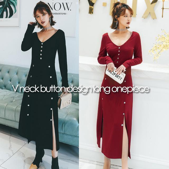 大きいサイズ レディース 両Vネックボタンデザインロングワンピース 長袖 秋冬