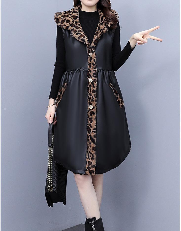 大きいサイズ レディース 秋冬 ヒョウ柄 コート アウターエコレザー フェイクレザー 袖なし