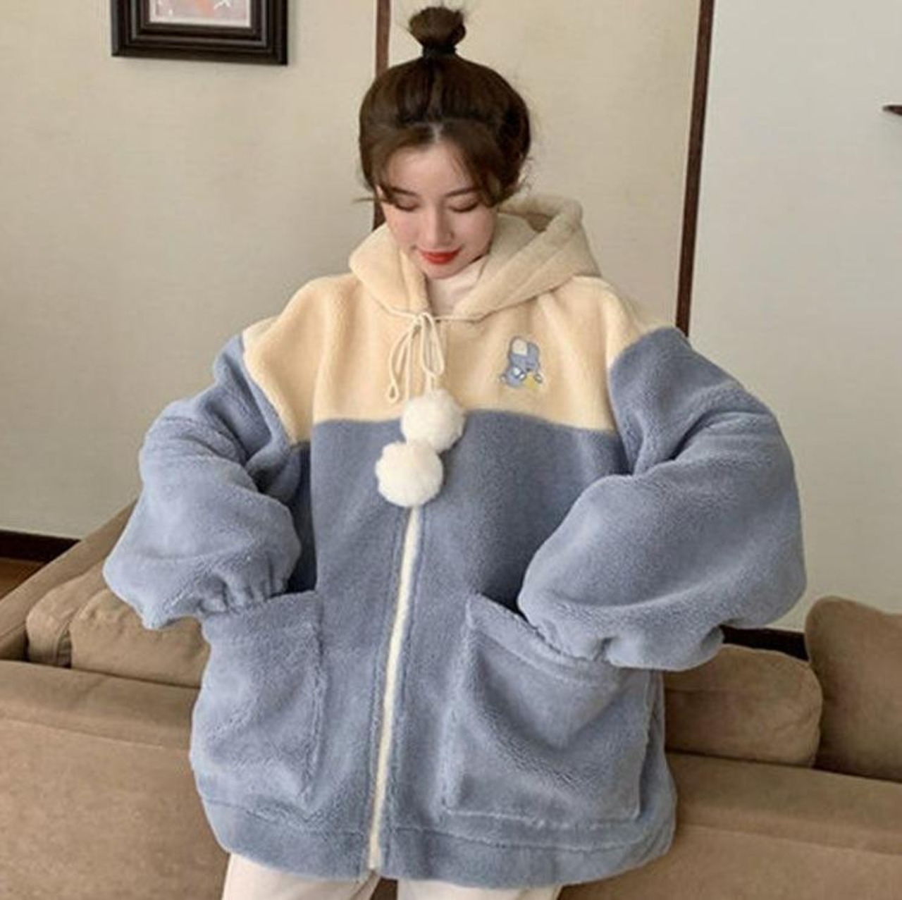 フード付き バイカラー ポンポン付き 体型カバー 前開き モコモコ あったか かわいい