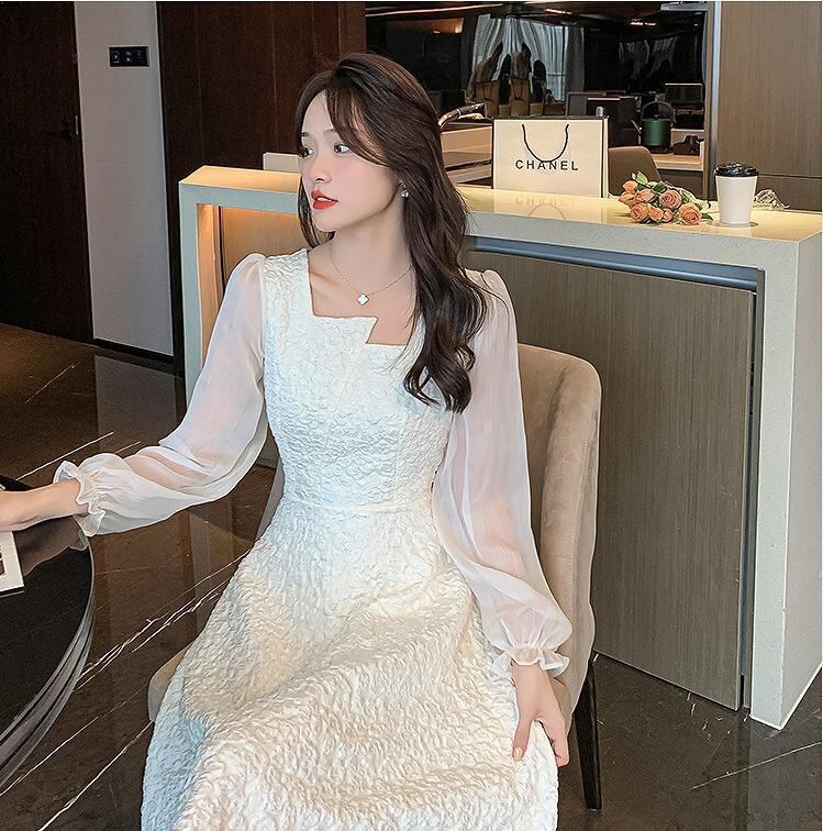 大きいサイズ レディース ワンピース シアー袖 ジャガード 春 秋冬 新品 長袖 スクエアネック