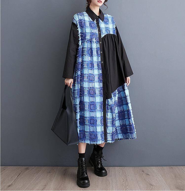 大きいサイズ レディース ロング ワンピース ブルー シャツ 春 秋冬 新品 長袖